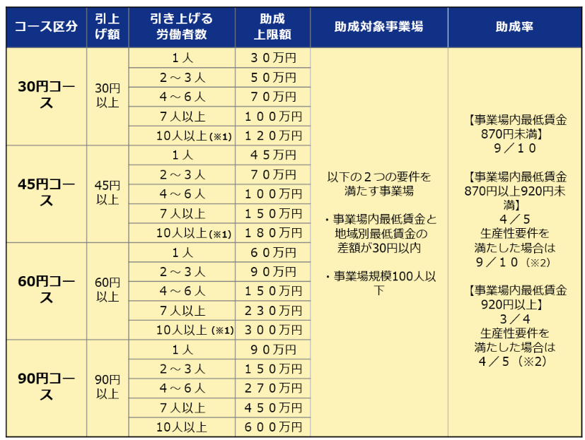 上限額は引き上げ額と引き上げる労働者数に準じ、助成率は事業内最低賃金の額(870円未満、920円未満、920円以上)によって変わります。また、生産性要件を満たすと助成率が引き上げられます。